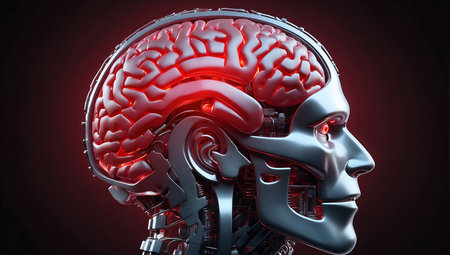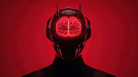 A red-lit futuristic robot head with a glowing brain, representing the future of artificial intelligence and advanced technological innovations in the digital world.