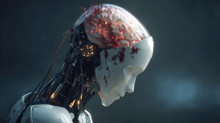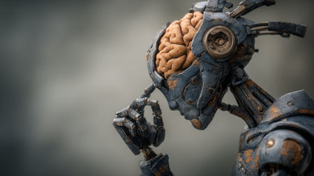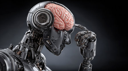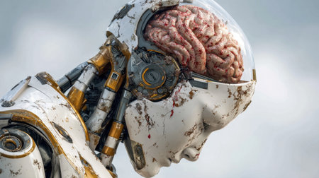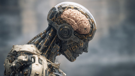 This striking image features a futuristic robot with an exposed brain, symbolizing the intersection of technology and humanity in a thought-provoking manner.