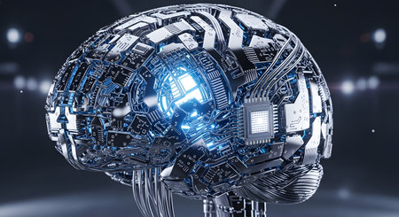 A highly detailed and futuristic representation of a human brain, composed of microchips, circuitry, and metallic components, with a glowing blue light at its center, symbolizing advanced technology and artificial intelligence.