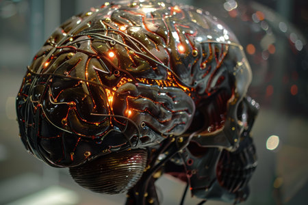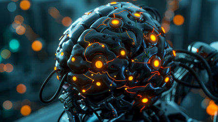 Futuristic concept of a robotic brain with glowing orange connections and high-tech surface. generative ai