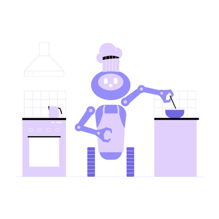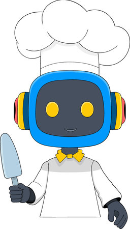 Futuristic vector illustration of an intelligent AI chef robot with cooking utensils, ready to replace human chefs