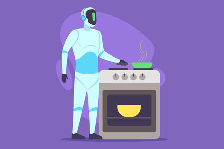 Robotic chef standing by stove, stirring frying pan on top of burner against vibrant purple background. Robots and culinary activity concept