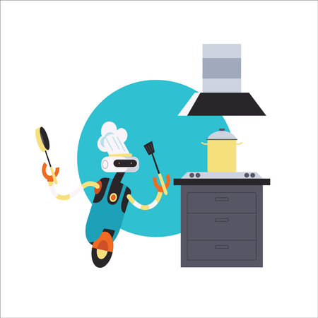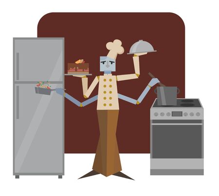 Multifunctional cook robot android cooks food in the kitchen. Vector illustration