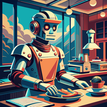 A friendly robot waiter serves food in a futuristic diner. This illustration is perfect for showcasing themes of AI. automation. and the future of service.