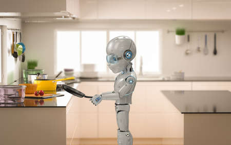 Robot in the kitchen. Artificial intelligence concept. 3d rendering.
