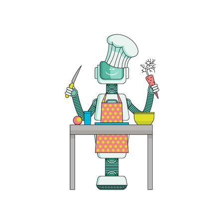 Robot cook prepares food in kitchen isolated on white background. Cartoon character of android housekeeper in apron and chef hat with knife and vegetables in arms makes dinner. Vector illustration.