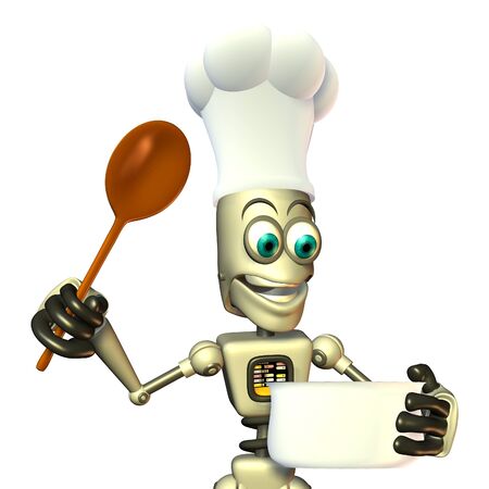Computer-generated image of a robotic chef. Robots and Automation in the kitchen automate the cooking and preparing of ingredients and meals in the future
