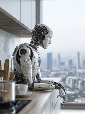 A robot sits on a kitchen counter, looking out over a city skyline through a window in a sleek, modern apartment during daytime.