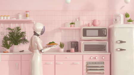 Retro-futuristic robot cooking in a vintage pink kitchen setting.