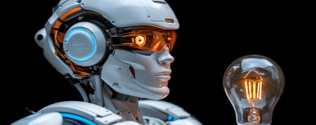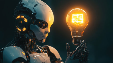 A futuristic robot holding a glowing light bulb, symbolizing the merging of technology and human creativity