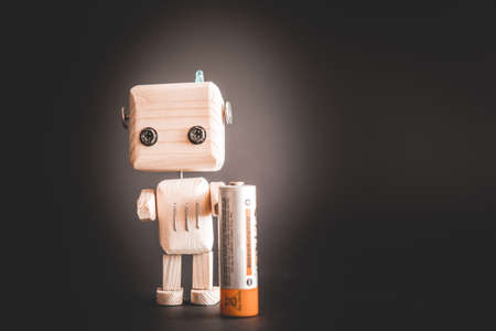 wooden robot with battery, concept of waste recycling, environmental conservation, battery recycling. nature versus technology