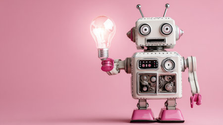 A charming vintage robot stands against a pink backdrop, proudly holding a glowing light bulb, symbolizing ideas and creativity in a whimsical manner.