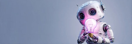 A small robot with large expressive eyes stands against a solid backdrop, holding a glowing light bulb, representing ideas and innovation.
