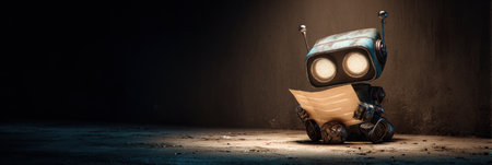A small robot sits on a dusty floor, focused on reading a piece of paper under soft lighting in a dark space.