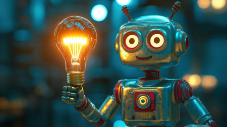 A charming robot character holds a glowing light bulb, symbolizing innovation and creativity in a vibrant, futuristic setting filled with technology.