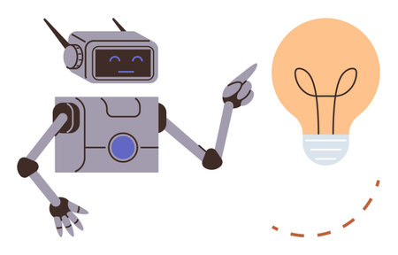Robot with mechanical arms and smiling face gestures towards a glowing light bulb. Ideal for innovation, creativity, artificial intelligence, science, invention, problem-solving, technology. A simple