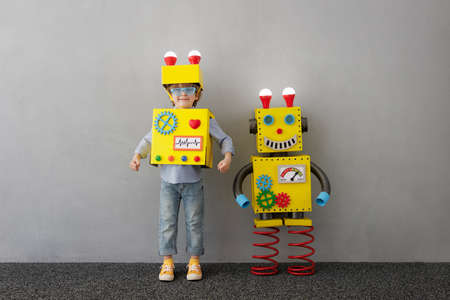 Happy child with robot. Funny kid have an idea. Success, creative and innovation technology concept