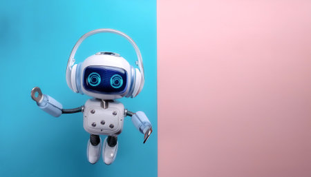 AI robot is listening to music on its headphones floating, isolated on a soft blue and Pink Pastel