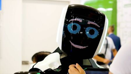 Big funny robot with big blue eyes smiling and talking, showing emotions, modern technologies concept. Media. Face screen friendly robot at the scientific exhibition.