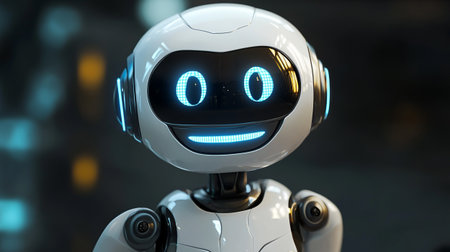 Friendly robot with glowing eyes in a modern office representing technology and artificial intelligence.