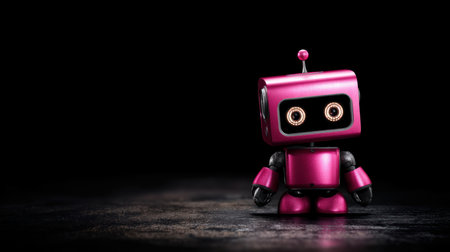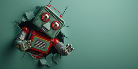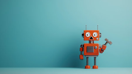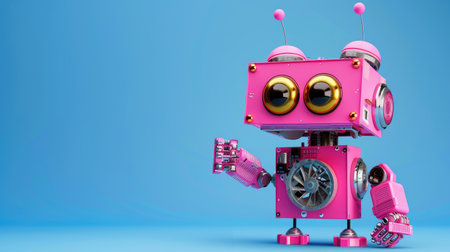 Vintage tin robot toy isolated on colorful neon background with copy space