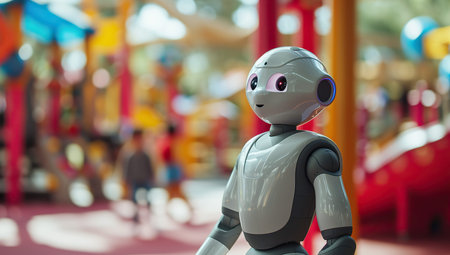 A charming robot with colorful heart decals stands still, displaying a friendly personality within a modern exhibit.