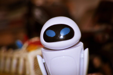 MOSCOW, RUSSIA - OCTOBER 12, 2018: 3D Print Expo - white robot with blue eyes at technology exhibition. Future, kawaii and robotic concept
