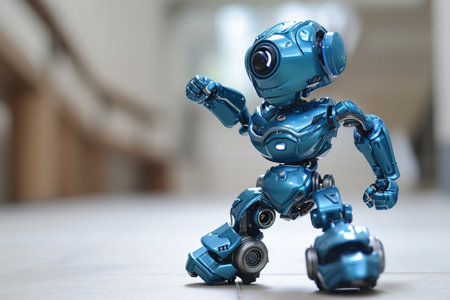 Vintage tin toy robot walking on light hardwood flooring in natural lighting