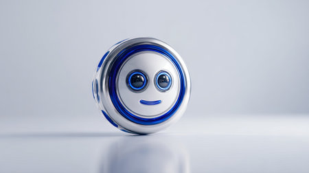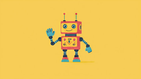 Minimalist Flat Art of Simple Smiling Robot with Bright Colors and Friendly Design. Bright yellow background.