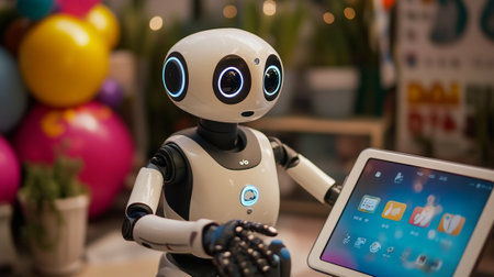 A friendly-looking robot is displayed in a contemporary office setting, demonstrating advanced innovation and design.