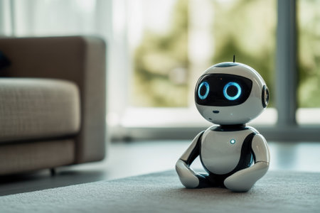 A small robot with bright eyes sits cross-legged on a carpet in a stylish living room, illuminated by sunlight.