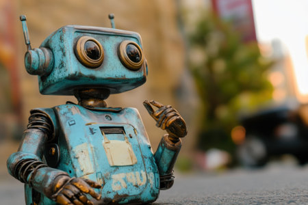 Vintage robot on wheels in urban alley with bokeh lights. Retro-futurism and city exploration concept. Quirky robotic character design. Street shot with blurred background. Copy space