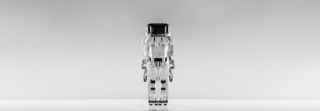 A humanoid robot stands upright in a bright studio, exhibiting sleek design and advanced technology features.