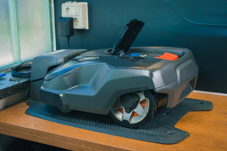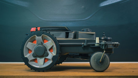 Dismantled robotic lawn mower or lawnmower on a workiung bench as part of an annual service. Parts of a robotic autonomous lawnmower.