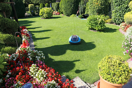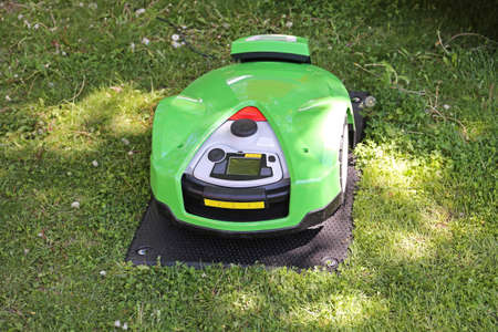 Automatic robot lawnmower mowing green grass on a lawn in a warm sunny summer day.