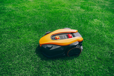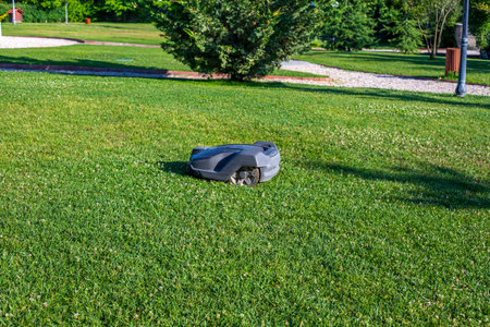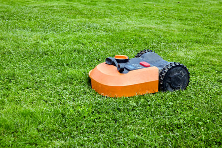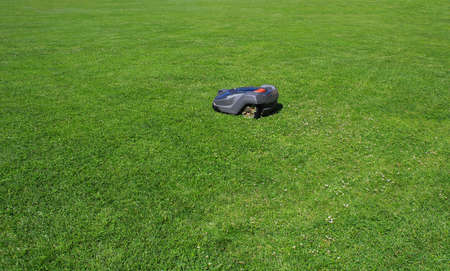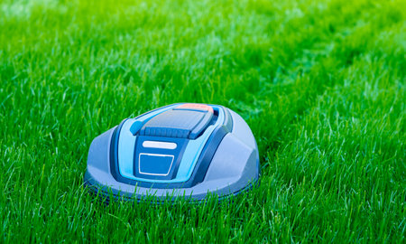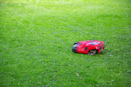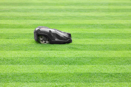 Robotic lawn mower on green grass field, concept of modern gardening