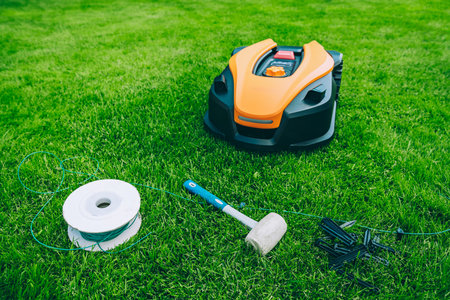 Ready to lays a cable and hammers in a plastic peg for autonomous operation of a robotic lawn mower. Roll of wire for robotic lawn mower, plastic pegs, connectors and robot.