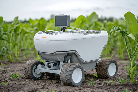 A high-tech robot navigates through a sunny agricultural field, tending to young green plants.