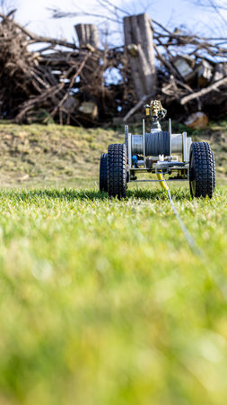 a solar-powered weeding robot rolling on lawn, created with generative ai