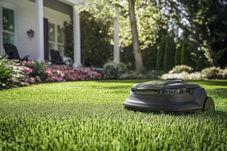 A robotic lawn mower moves quietly across a lush green lawn, meticulously maintaining the yard on a sunny day.