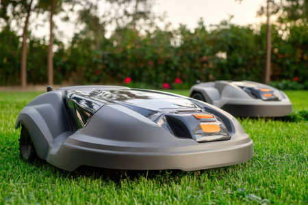 Robotic lawn mowers are actively trimming grass in a sunny garden, showcasing advanced gardening technology.