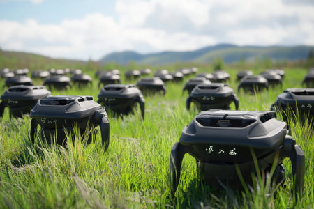 Rows of robotic devices are actively engaged in tasks across a vibrant green field on a sunny day.