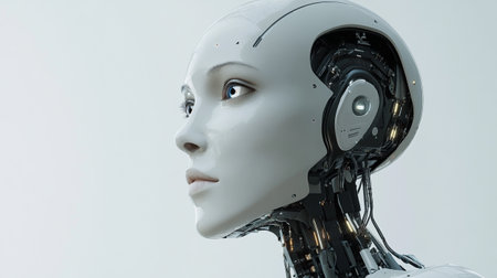 Close up of a white and chrome android with exposed circuitry, evoking thoughts about the future of artificial intelligence