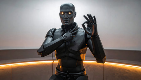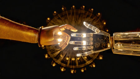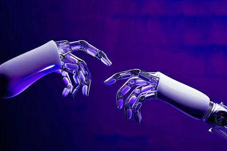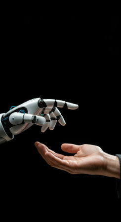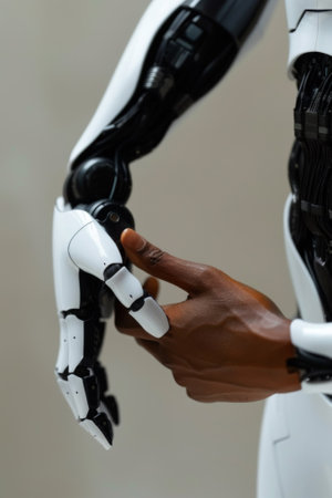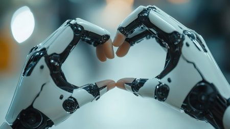 Precision-engineered robotic fingers gently intertwine, creating a symbolic symbol of harmony between technology and human emotion.