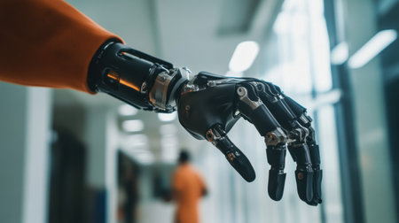 A prosthetic arm is actively engaged in a task within a contemporary medical facility, showing advanced technology and design.