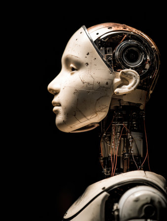Detailed view of a humanoid robot showing its internal components and smooth exterior in a dramatic lighting setup.