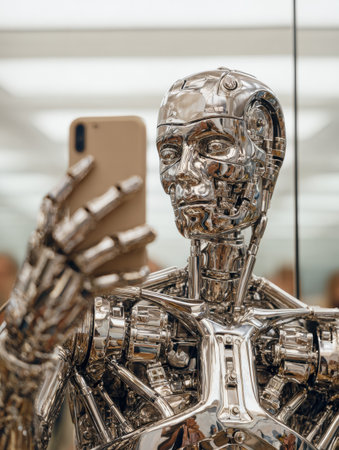 A shiny robot captures a selfie in a sleek, contemporary mirrored environment emphasizing its detailed metallic features and craftsmanship.