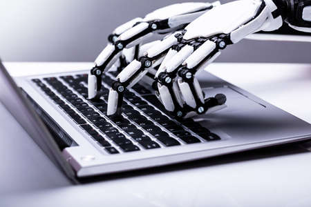 Close-up Of A Robotic Hand Using Laptop Over Desk