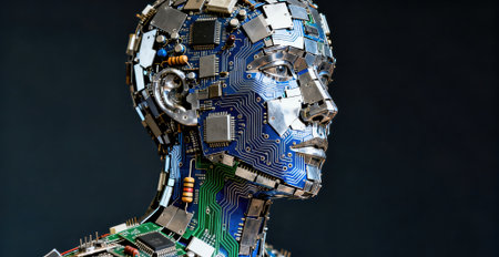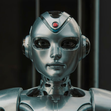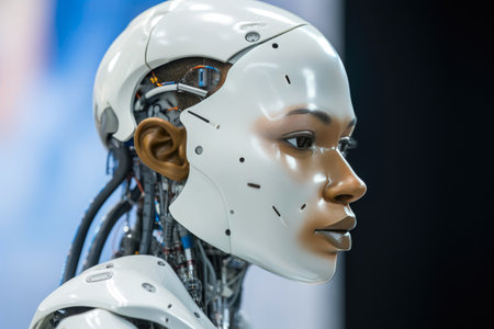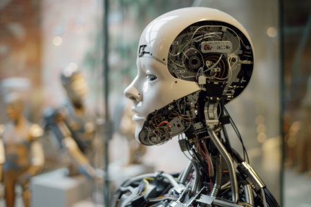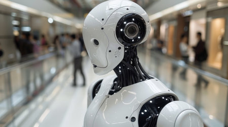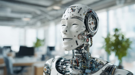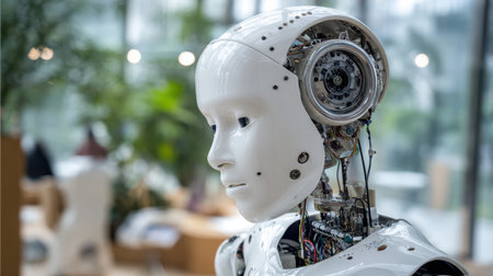 Futuristic humanoid robot with intricate mechanical components and sleek design, showcasing advancements in artificial intelligence and technology in modern environments