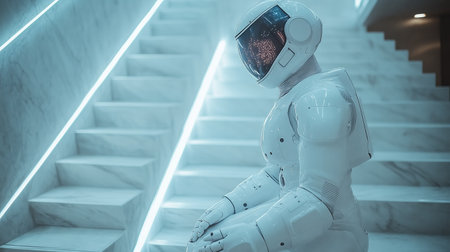 A sleek white humanoid robot is seen on futuristic illuminated marble stairs, showcasing advanced design and sci-fi aesthetics.
